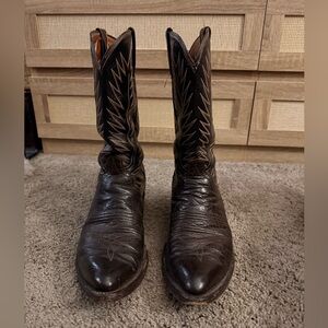 Classic brown leather western boots with decorative stitching. Durable leather construction for everyday wear. Comfortable fit with a traditional cowboy silhouette. Versatile brown color pairs well with casual and dress looks. Men's 9B- fit women's 10