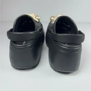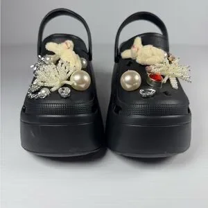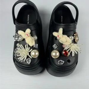 Brand new in box Azalea Wang Davies Black platform clogs featuring playful decorative charms including pearls, rhinestones, and bunny accents. These chunky platform clogs combine comfort with a bold fashion statement.
