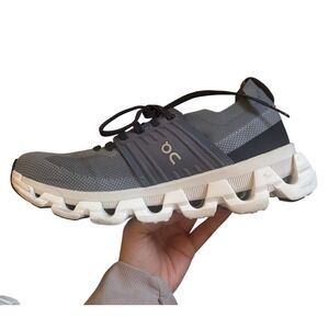 On Cloudswift running shoes in a versatile grey and black colorway. Designed with Swiss engineering, these performance sneakers feature Helion superfoam for superior cushioning and CloudTec technology for a smooth ride. The breathable engineered mesh upper provides a secure, sock-like fit, while the durable rubber outsole offers excellent traction on road surfaces. Ideal for urban running and everyday active wear.
