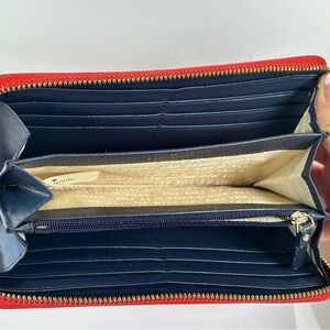 Notable features: Zip around closure, gold tone hardware, navy interior, multiple card slots, bill compartments, interior zip coin pocket.