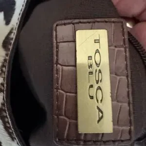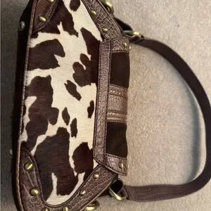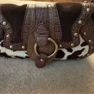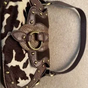 TOSCA BLU shoulder bag with mixed leather and cowhide panels. Decorative brass-tone hardware and stud details. Fold-over flap with ring buckle accent. Stylish for casual or dressy looks. ***beautiful bag but reposhing because I only needed it for a themed party :)**