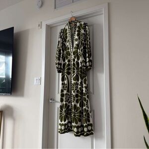 Embrace effortless charm with the Green Palermo Buttoned Puff Sleeve Maxi Dress from FARM Rio. Its vibrant green hue dances with subtle tropical patterns, while puffed sleeves bring a playful volume to the silhouette. The flattering V neckline adds a touch of softness, perfectly balancing the dress's flowing maxi length. This piece feels like a gentle breeze on a summer day, inviting ease and joyful movement wherever you go.