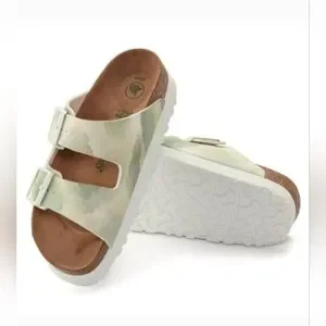 Birkenstock Women's Arizona Vegan Platform Sandals. Womens size 9. New with tags. A platform sole takes the Arizona's iconic design to new heights—and your style along with it. Soft spring shades blend into one another for a watercolor effect across smooth and durable Birko-Flor®. Its vegan upper and footbed lining gives you a style you'll love inside and out. With an original BIRKENSTOCK footbed for the ultimate in all-day support.