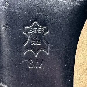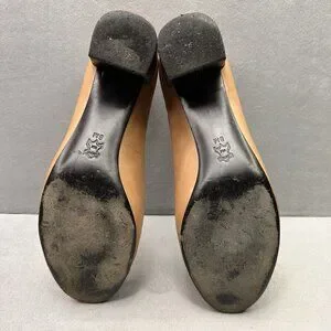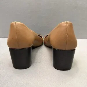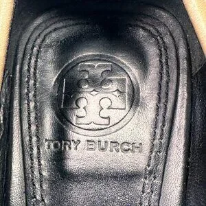 Classic Tory Burch leather pumps. Tan upper with black cap toe and block heel. Gold-tone trim and logo accent at toe. Cushioned leather insole. Elegant, versatile silhouette.