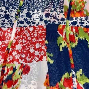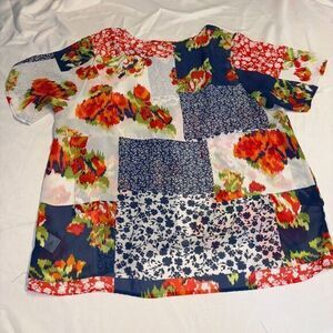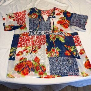Valerie Stevens Shirt Womens XL Red/Blue Floral Short Sleeve Sheer Cinch Waist