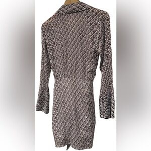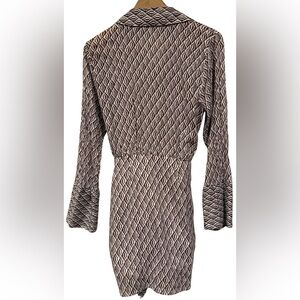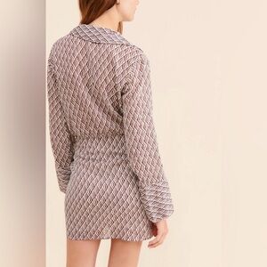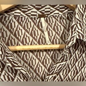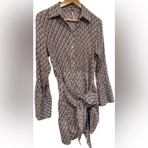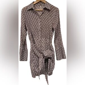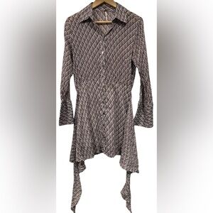 The Free People 100% Cotton Gauze Rillo Mini Shirtdress in XS is a boho chic piece perfect for various occasions such as travel, parties, or casual outings. This earth tone dress features a geometric pattern, collared neckline, and button closure with a tie waist accent. Made from lightweight woven cotton fabric, this short dress with bell sleeves is ideal for a laid-back yet stylish look, perfect for spring, summer, and fall. Hand wash only to preserve its quality, this dress is a versatile and fashionable addition to any woman's wardrobe.