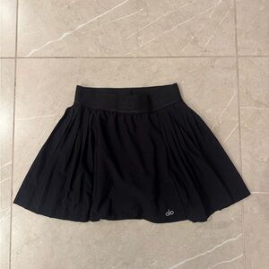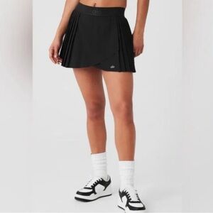 Black pleated skort with a wrap-front overlay. Elastic waistband with subtle Alo logo. Lightweight and flexible for active days. Modern sporty silhouette for versatile wear.