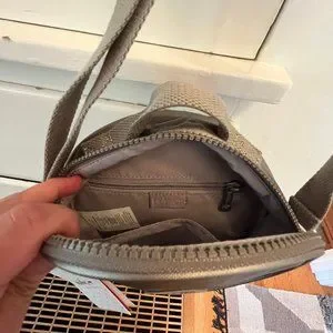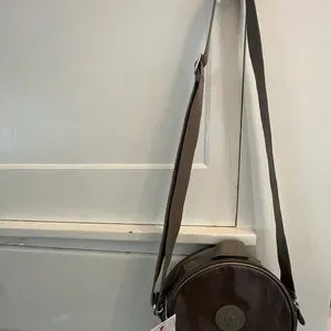 Round crossbody bag with wide adjustable strap. Metallic bronze tone with tonal logo patch. Includes signature plush monkey charm. Zip closure for secure storage. Casual yet stylish look.