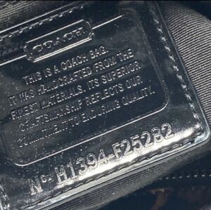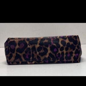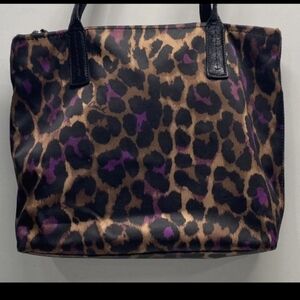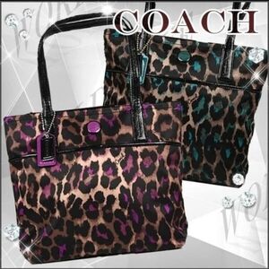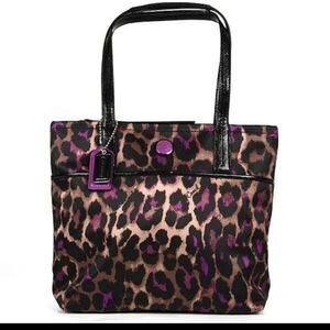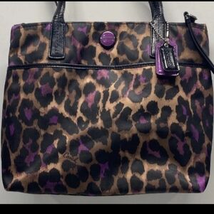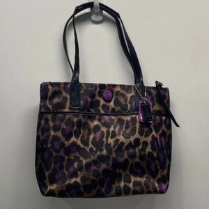Coach tote with bold leopard print. Brown and purple spots on a tan background. Black leather handles and trim. Front slip pocket and signature charm. Sleek and functional for daily use.