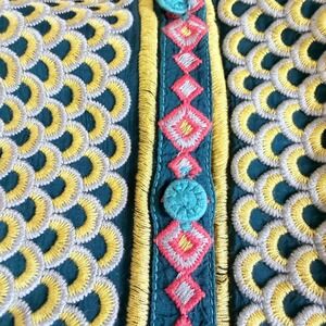 Intricately embroidered tunic top features a rich teal cupra rayon fabric adorned with vibrant floral and geometric needlework. This long-sleeve piece showcases a split neckline with button-loop closures and delicate open-work detailing along the front placket and hem. The back is beautifully finished with tonal floral embroidery, creating a cohesive and artistic look perfect for bohemian styling.