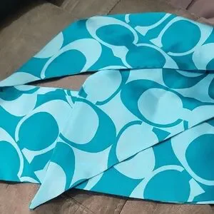 Lightweight scarf featuring oversized Coach signature motifs. Vibrant teal and aqua tones. Smooth, lustrous surface. Versatile accessory for polished looks.