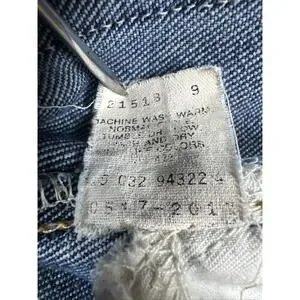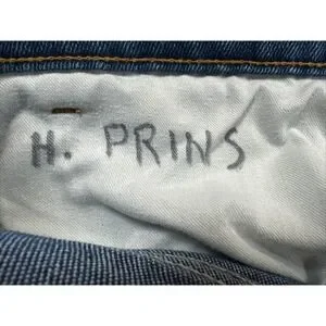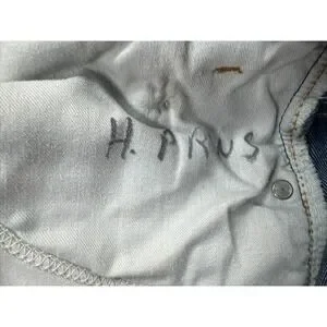 Faded overall with a name written on the pockets.