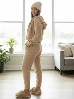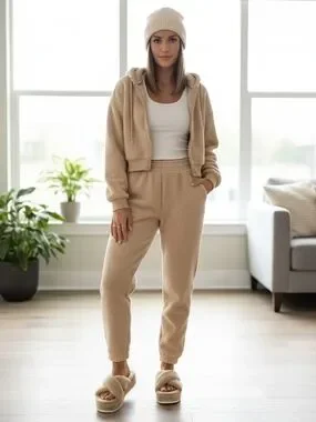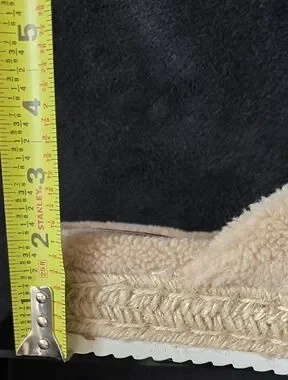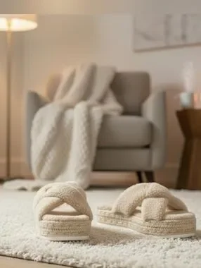 Plush shearling platform slide in a soft cream tone. Textured rope-wrapped sole adds casual charm. Simple, comfortable slip-on style. Perfect for relaxed indoor wear.