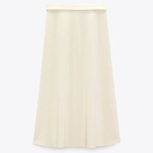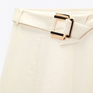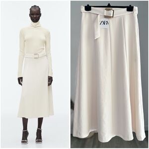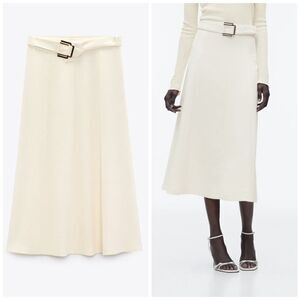 High waist midi skirt with belt loops at waist. Self belt with metal buckle. A-line silhouette. Side hidden in-seam zip closure.