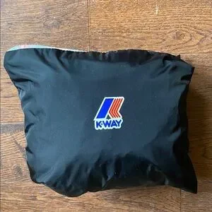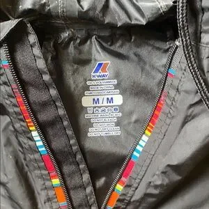 Lightweight and packable K-Way men’s jacket in black, size Medium. Features a half-zip front with colorful striped zipper detail, adjustable hood, and elastic cuffs and hem for a secure fit. Made with water-resistant fabric, perfect for layering in unpredictable weather. Classic K-Way logo on the chest. DC Branding at the wrist.