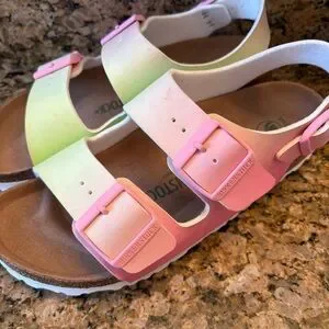 Birkenstock Milano vegan sandals. These are a size 38/8 and the colors candy pink and faded lime. Excellent condition.