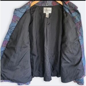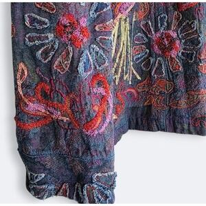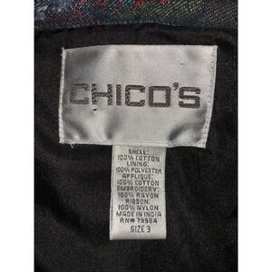 Button-front Chico's light denim jacket with a classic collar and long sleeves. Features an all-over intricate floral embroidery pattern in multiple colors and incorporates beaded accents, patchwork fabrics, and ribbon detailing adding texture to the design. Fully lined. Really cool & unique piece, like a work of art!