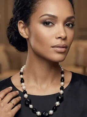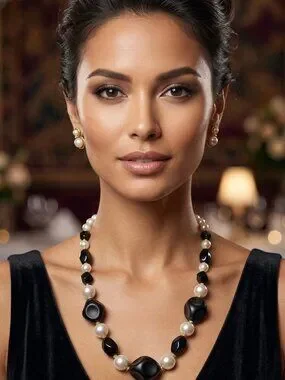Elevate your look with this stunning, high-contrast statement necklace. This piece perfectly blends classic elegance with a bold, modern silhouette. Featuring a rhythmic pattern of lustrous creamy white pearls and oversized, geometric black resin beads, it’s the ultimate accessory for adding a touch of "Parisian Chic" to any outfit.