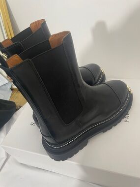Sandro Black Leather Lace-Up Boots with Gold Toe Accents