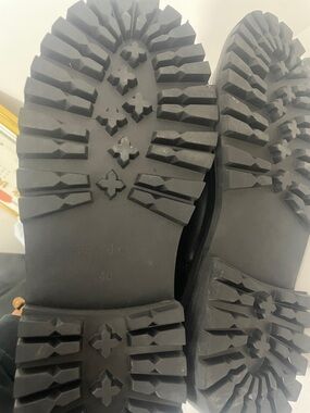 Sleek black leather lace-up boots by Sandro. Chunky lug sole for traction. Decorative gold-tone hardware at toe. Clean rounded toe and streamlined shaft.