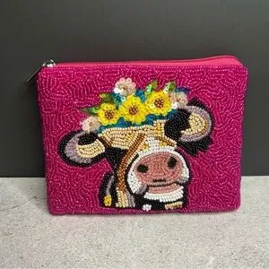 Vibrant pink beaded cosmetic bag featuring a charming cow design. Perfect for organizing your essentials with style.