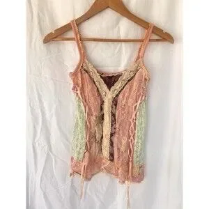VTG Fairy Grunge Patchwork Lace Corset Cami Tank Top Pink Green Ribbon Floral XS