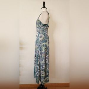 Lightweight blue-green floral maxi dress with adjustable straps. Soft patterned fabric creates a relaxed boho look. Includes a brown belt for a defined waist. Versatile summer dress that layers well and moves comfortably.