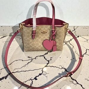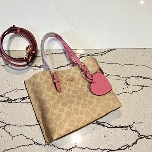 Coach signature canvas tote with pink leather trim. Features a detachable crossbody strap and heart charm for a stylish finish. Designed for everyday use with secure zip closure. Pink accents add a feminine touch.