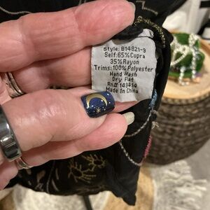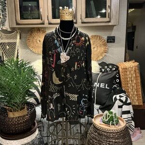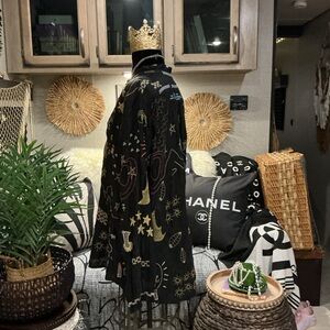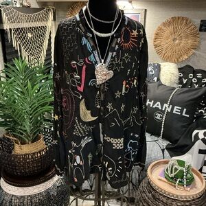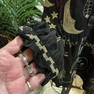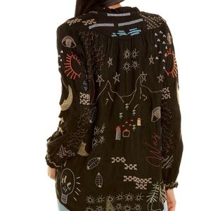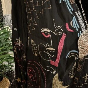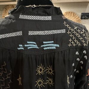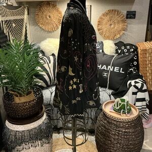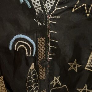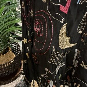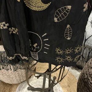 Black long-sleeve blouse with colorful embroidered whimsical motifs. Button-front placket and relaxed silhouette. Lightweight, flowy fabric for easy layering. Playful embroidery adds vibrant interest. This top is beyond beautiful and It’s too small for me now , otherwise I would not be selling it . It’s one of my favs . So soft and flowy , feels like silk , so luxurious with tons of embroidery . You will love this as much as I do , guaranteed! Very gently worn . Size S ( true to size)