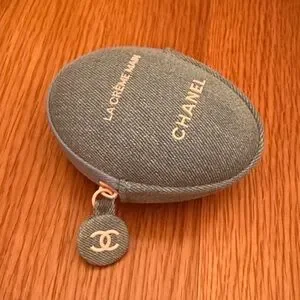 CHANEL oval denim pouch with gold logo lettering. Compact design for small essentials. Zippered closure with branded pull. Stylish accessory for everyday use.