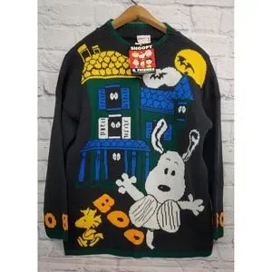 Vintage Snoopy sz Large Halloween Sweater Woodstock BOO Haunted House USA NEW