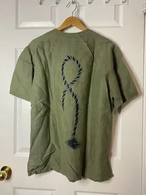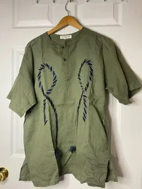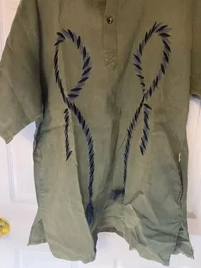 Vintage Yves Saint Laurent men's short-sleeve button-down in olive green. Navy rope-style embroidery on the front. Band collar with partial placket. Relaxed, lightweight fit with side vents.