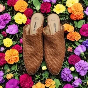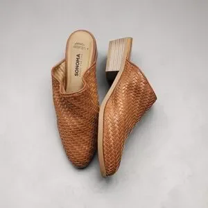 Tan woven leather slip-on mules. Cushioned insole for comfort. Easy slip-on style for everyday wear. Textured woven upper adds visual interest. Neutral tan pairs well with many outfits.