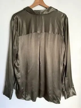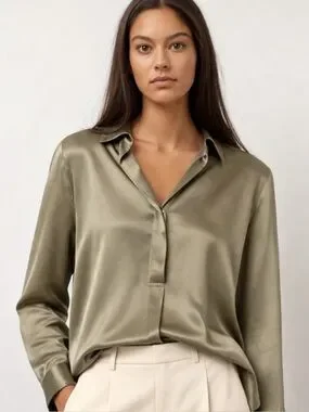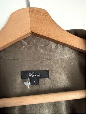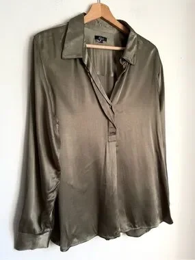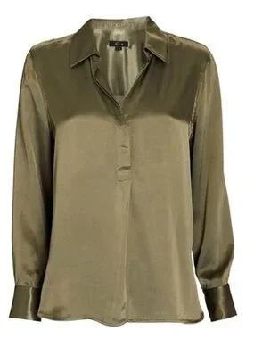 Rails, The Nissa Top looks as elegant with a pair of jeans as it does with a matching satin skirt. Done in a rich Olive shade, the pullover top is designed in a satin back crepe with a concealed half placket, curved shirttail, and split side seams.