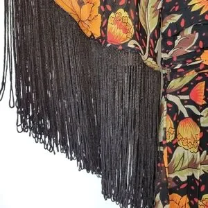 This elegant black mini dress by Verb by Pallavi Singhee features a beautiful floral pattern and fringed accents. The dress has a V-neckline, half kimono sleeves, and a zipper closure. It is perfect for a variety of occasions, including travel, holy communion, parties, and casual wear. The dress is made of viscose and has a rayon fabric type. It is recommended to dry clean only. The dress is a size S and is suitable for regular size types. It is not personalized and is not vintage. The dress is perfect for fall and has features like lining and a zipper. It is a great addition to any wardrobe and is perfect for fashion-conscious women.