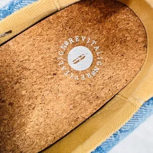 Revitalign Hermosa Sneaker in blue denim floral. Lightweight cotton canvas upper, cork trim. Elastic stretch laces for easy slip on/off. Doctor designed orthotic support, full contact comfort footbed with metatarsal dome, deep heel cup, forefoot cushioning and arch support. 5 star reviews, featured on Good Morning America!