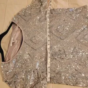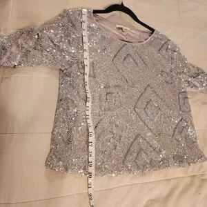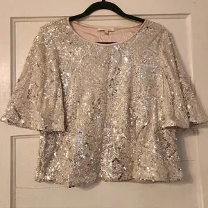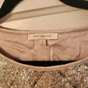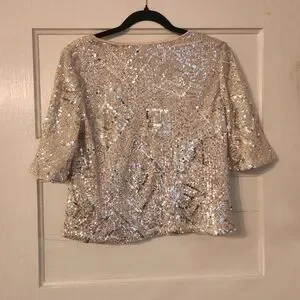 Beautiful silver sequined short sleeved top. It is a shorter length, likely cropped for most. Size small, by Skies are Blue. Excellent used condition, no tears or stains. Great for parties, cocktail hour or a night out.