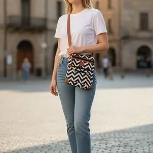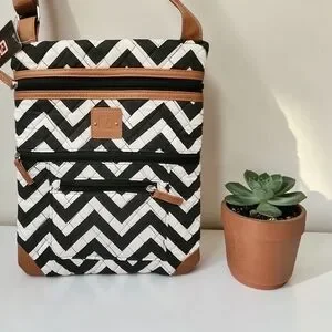 Crossbody bag with chevron pattern. Adjustable tan strap and accents. Multiple zip pockets for organization. Lightweight and stylish for daily use.