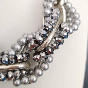 worn a few times. Noted flaws-definite marks on silver links. Digs, scrapes and scratches. You can see on center links where they don't come together. Minimal marks on silver beads from normal wear. Otherwise, good/fair condition. Still very wearable.