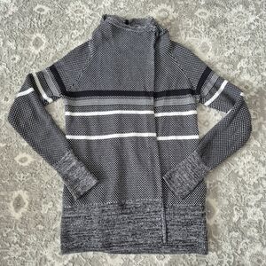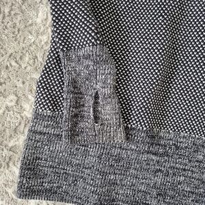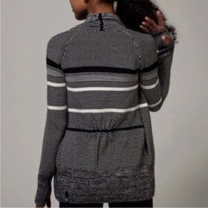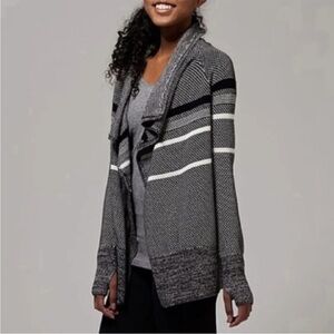 Tags: ivivva, lululemon, girl's size 14, wrap cardigan, cotton sweater, thumbholes, cowl neck, activewear, dance sweater, textured knit, black and white, athleisure, cozy layer.