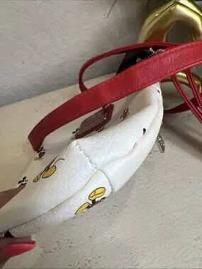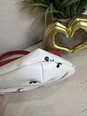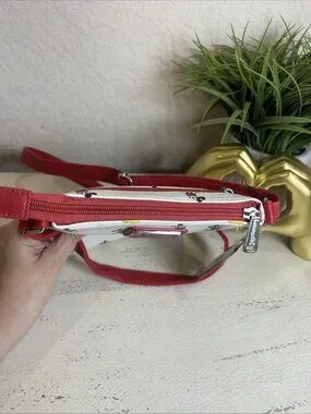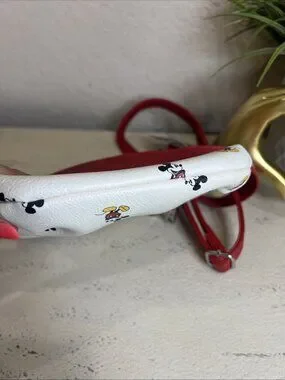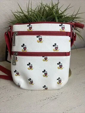 The Loungefly Disney Mickey Mouse Crossbody Bag is a stylish and functional accessory perfect for travel, casual outings, or workwear. This small-sized bag features a zip closure, red crossbody strap, and silver hardware accents. The multicolor exterior with a Mickey Mouse pose pattern adds a playful touch, making it a standout piece for Disney fans. Made from vinyl, polythylane, and acetate, this bag is durable and trendy, with a fabric lining in a matching red color. The Loungefly brand ensures quality and design, making it a must-have for any Disney enthusiast. A few small scuffs, does not impact functionality. See pictures as they are part of the condition and description.