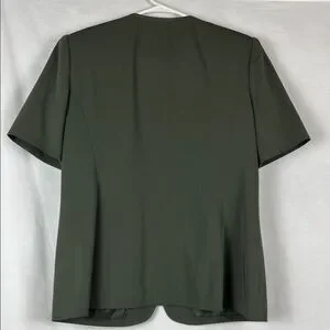 This is a beautiful vintage Kasper for ASL dark olive green military style women's skirt suit! It is a size 10 petite. Pit to pit is 19.5 inches and shoulder to bottom hem on the top is 25 inches. There are even shoulder pads! The waist of the skirt is 32 inches and it is 26 inches long. It is fully lined.
