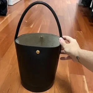 Elegant black bucket bag with a cream interior. Ideal for versatile styling.