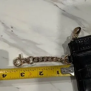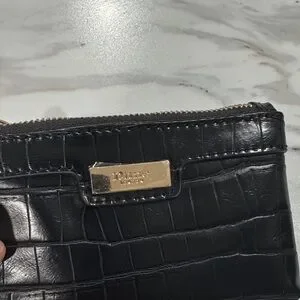 Elegant black wristlet with croc-embossed design. Features gold-tone logo plate. Ideal for chic outings.