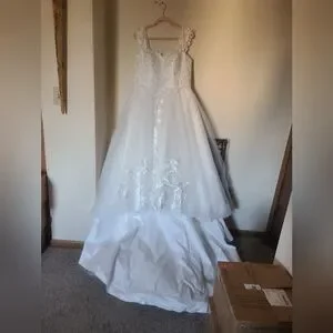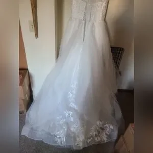 Beautiful white A-line wedding dress featuring a lace-adorned bodice and floral appliqué cascading down the skirt. Supportive straps and a structured waistline create a flattering silhouette. Soft tulle overlay adds romantic volume while maintaining an elegant, timeless look.