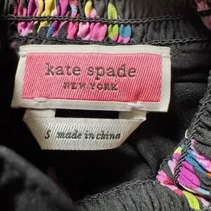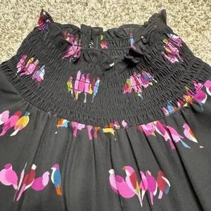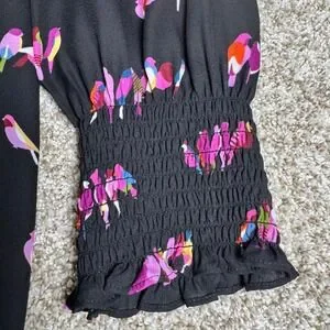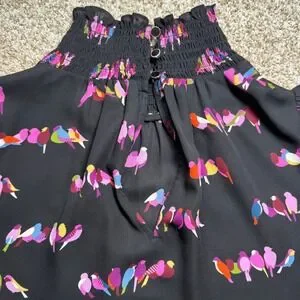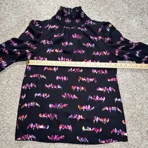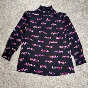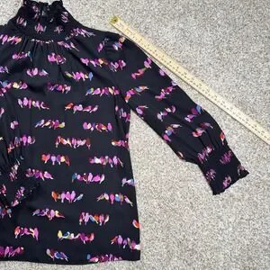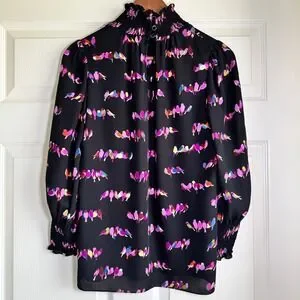 Kate Spade New York long sleeve blouse features a charming multi-color bird print set against a classic black background with 3 black button closure in back of neck. Designed with a sophisticated smocked high neck and matching smocked cuffs, this top offers a refined silhouette with a touch of whimsical flair. The lightweight fabric and fluid drape make it an ideal choice for transitioning from office wear to evening outings. Care tag cut out.