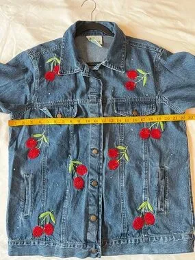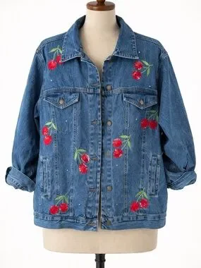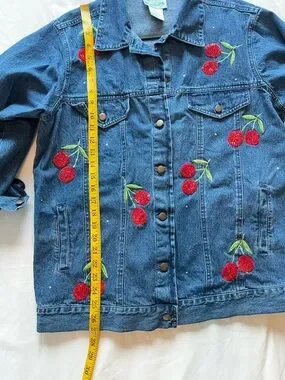 Quacker Factory Vintage Sequin & Embroidered Cherry Denim Jacket - Large - EUC