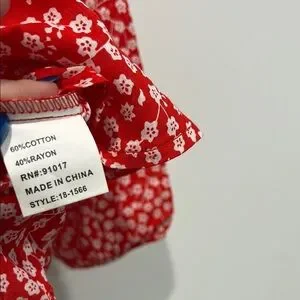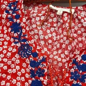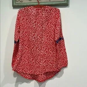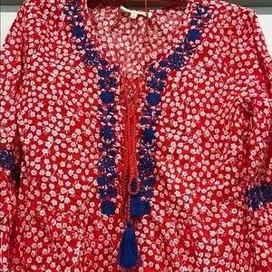 This Solitaire x Anthropologie size small women’s bohemian tunic top features a striking red and white micro flower print with blue embroidered flower pattern.