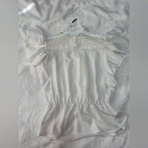 Cream button-front blouse with lace yoke and delicate flutter sleeves. Drawstring waist creates a softly cinched silhouette. Lightweight drape with vertical lace inserts for subtle texture. Versatile feminine top for work or events.