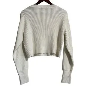 Ribbed knit cropped sweater in a clean ivory white features a classic crew neckline and long sleeves with functional thumbhole cuffs. The soft acrylic blend provides a comfortable stretch fit that pairs perfectly with high-waisted denim. This item is in excellent pre-owned condition with no visible flaws.